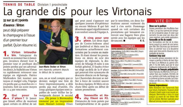 En P1, le titre de Champion est promis à Virton. Qui pour la 2ème place ? Biermonfoy emmené par un impressionnant Manu Lonnoy ? En superdivision dames, Marine Dropsy (Virton) rejouera-t-elle un jour ? En Nationales et Régionales messieurs, les Godîs sauvent la mise.