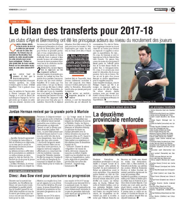 Le bilan des transferts pour 2017-18. Les clubs d’Aye et Biermonfoy ont été les principaux acteurs au niveau du recrutement des joueurs !