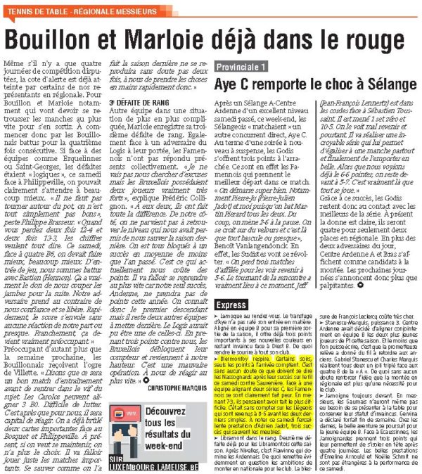 Revue de presse par Gaël Lardot | Oct 9, 2017 | Presse | 0 commentaires Régionale : Bouillon et Marloie dans le rouge. Biermonfoy respire ! La Meuse du Luxembourg – 09/10/17 Tous les résultats du we Poster le commentaire Annuler la réponseVous devez vous connecter pour publier un commentaire.