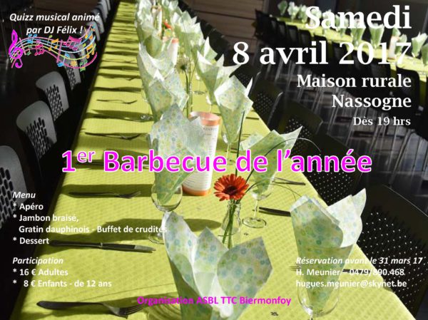 Vous n’êtes pas sans savoir que notre traditionnel souper annuel se déroulera le samedi 8 avril dans la Maison rurale de Nassogne. Rejoignez-nous nombreux pour le…premier barbecue de l’année !!!