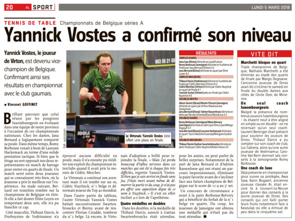 Résultats des joueurs de notre Province lors des championnats de Belgique 2018. Y Vostes (Virton) a atteint la finale !