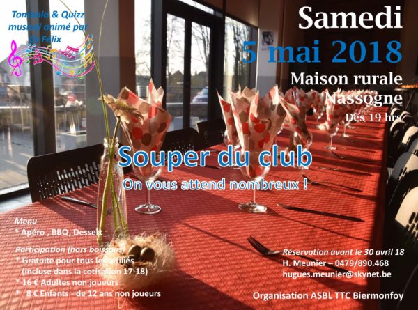Vous n’êtes pas sans savoir que notre traditionnel souper annuel se déroulera le samedi 5 mai dans la Maison Rurale de Nassogne. Pour rappel , le paiement de la cotisation incluait le prix du souper (hors boissons) ! Donc c’est GRATUIT pour tous nos affiliés ! Il va de soit que tout le monde est le bienvenu (Parents, amis, connaissances,…) et vous trouverez ci-dessous de plus amples informations sur cette soirée. Une tombola et un quizz musical par équipe de 5 à 6 personnes seront organisés.