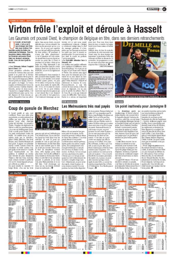 Revue de presse par Gaël Lardot | Oct 15, 2019 | Presse | 0 commentaires Tous les résultats de nos clubs en Nationale, Régionale et Provinciale ici. La Meuse du Luxembourg -14/10/2019 Poster le commentaire Annuler la réponseVous devez vous connecter pour publier un commentaire.