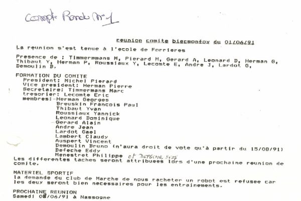 Le TTC Biermonfoy est né le 31 mai 1991 de la fusion des clubs de Forrières et de Nassogne. Ce rapprochement entre ces deux clubs voisins avait été désiré et initié à l’époque principalement par Michel Pierard (Président du club de Forrières) et Marc Timmermans (Secrétaire du club de Nassogne).