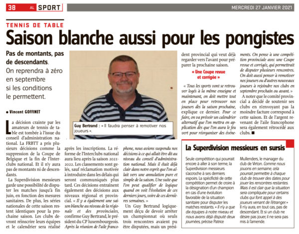 Revue de presse par Gaël Lardot | Jan 30, 2021 | Presse | 0 commentaires Vous trouverez-ci-dessous quelques articles de presse qui parlent de la fin prématurée de cette triste saison. L’Avenir – 27 /01/21 L’Avenir – 30/01/21 Poster le commentaire Annuler la réponseVous devez vous connecter pour publier un commentaire.